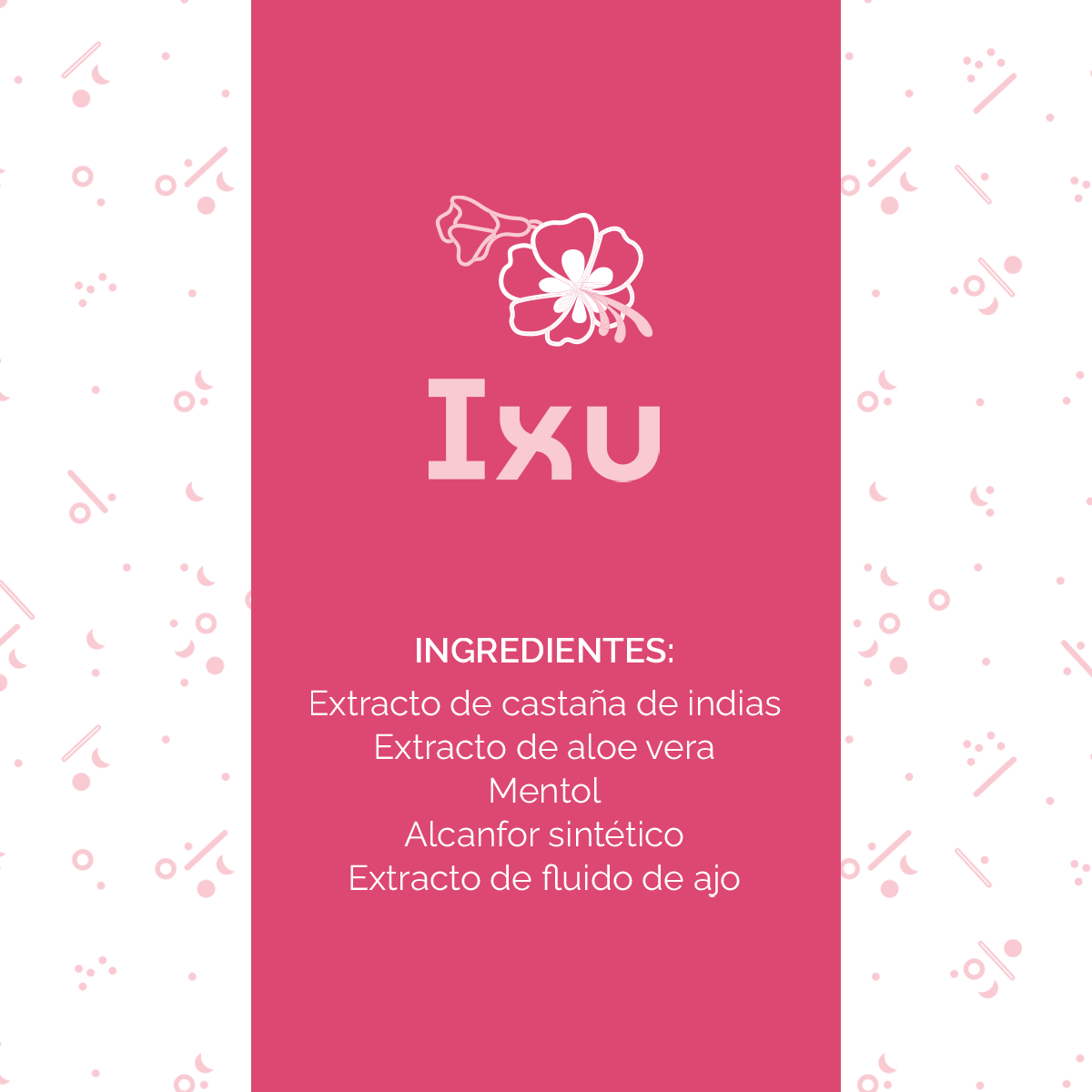 Extracto de castaña de indias, extracto de aloe vera, mentol, alcanfor sintético, extracto de fluido de ajo.